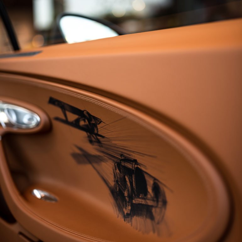 Le biplan ainsi que la première voiture de course à succès de Bugatti, la Type 13, sont commémorés dans une scène dessinée à la main sur les panneaux de porte.