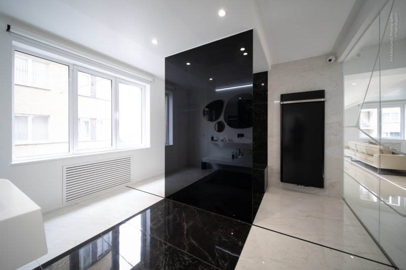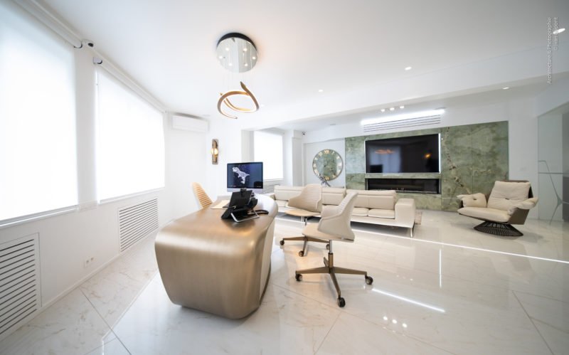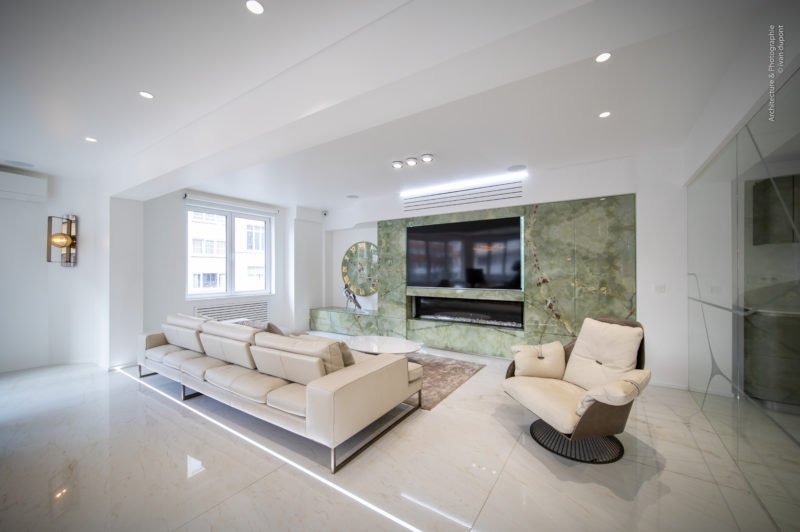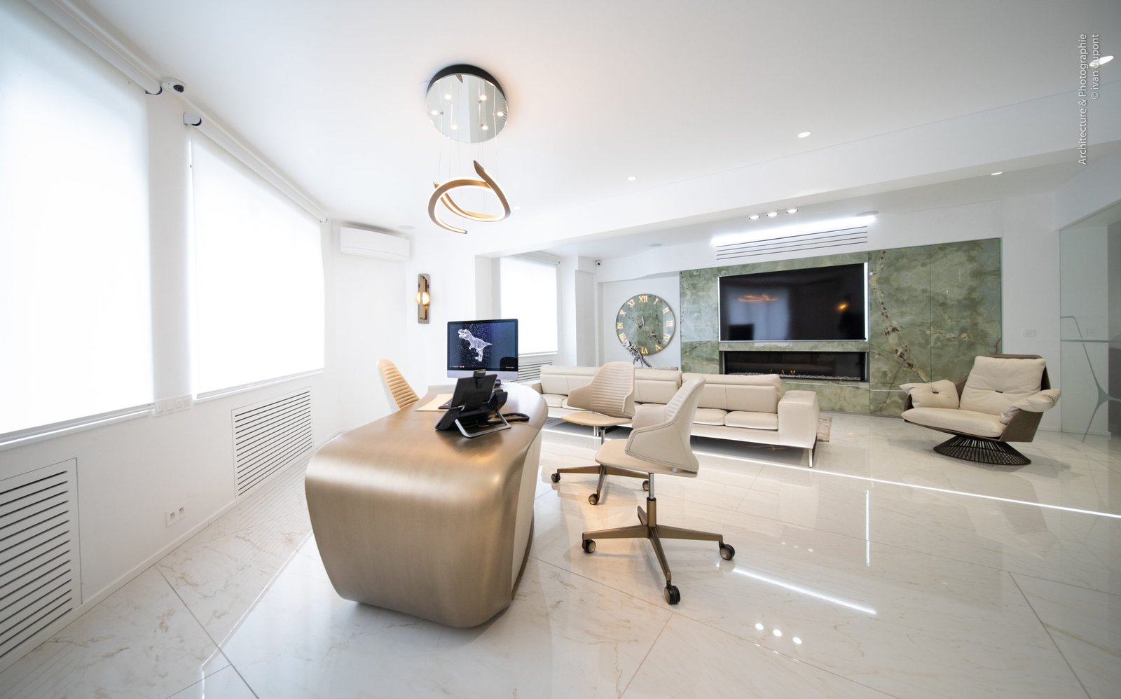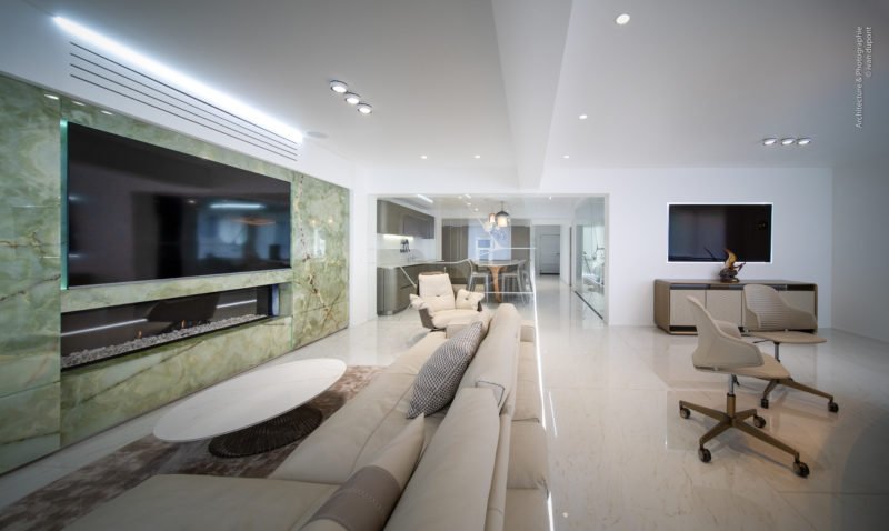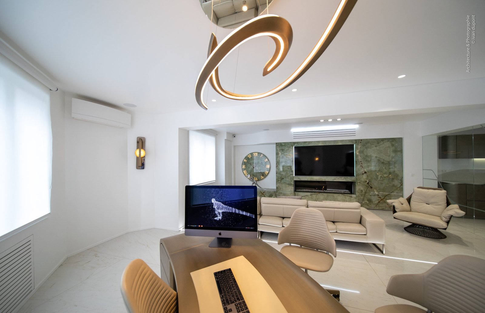 Jouissant d’une totale liberté en terme de style, notre maître décorateur, Ismaël Boufrahi, a pu exercer sans contrainte son sens affuté du détail, observable notamment à travers l’aménagement du salon. Ici, rien n’a été laissé au hasard. Notez l’alignement impeccable entre la table basse et le faux plafond ; ou encore le parfait unisson entre les lignes du canapé et le tableau au mur. Cette pièce à vivre se distingue également par l’absolue discrétion d’éléments visuels parasites; dans son extrême minutie, I. Boufrahi a fait pré-trouer les meubles pour faire disparaître, entre autres, les câblages disgracieux. « J’ai poussé le sens du détail très loin », explique-t-il. « J’avais envie de montrer jusqu’où il est possible d’aller si l’on décide d’exploiter au maximum le potentiel de l’espace mais aussi son propre potentiel face au design d’intérieur. »